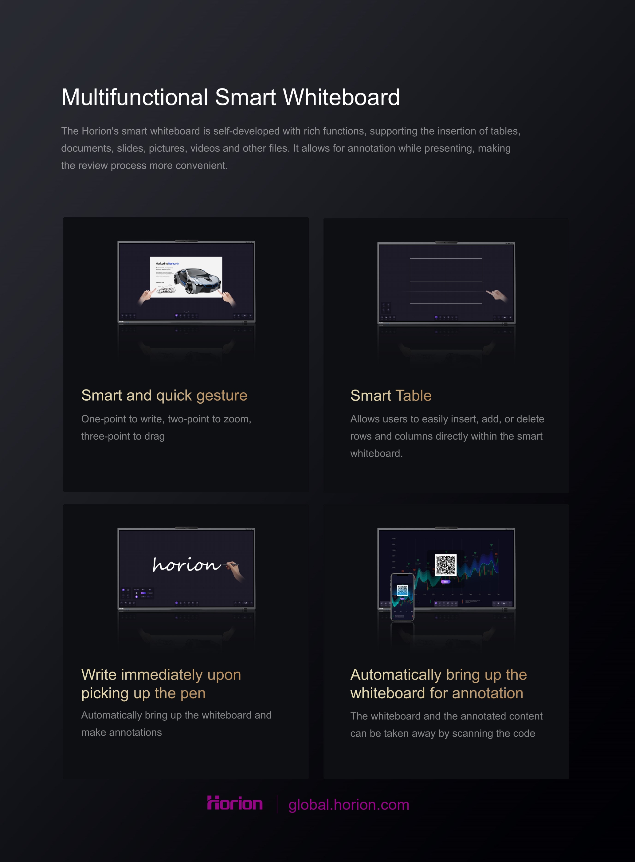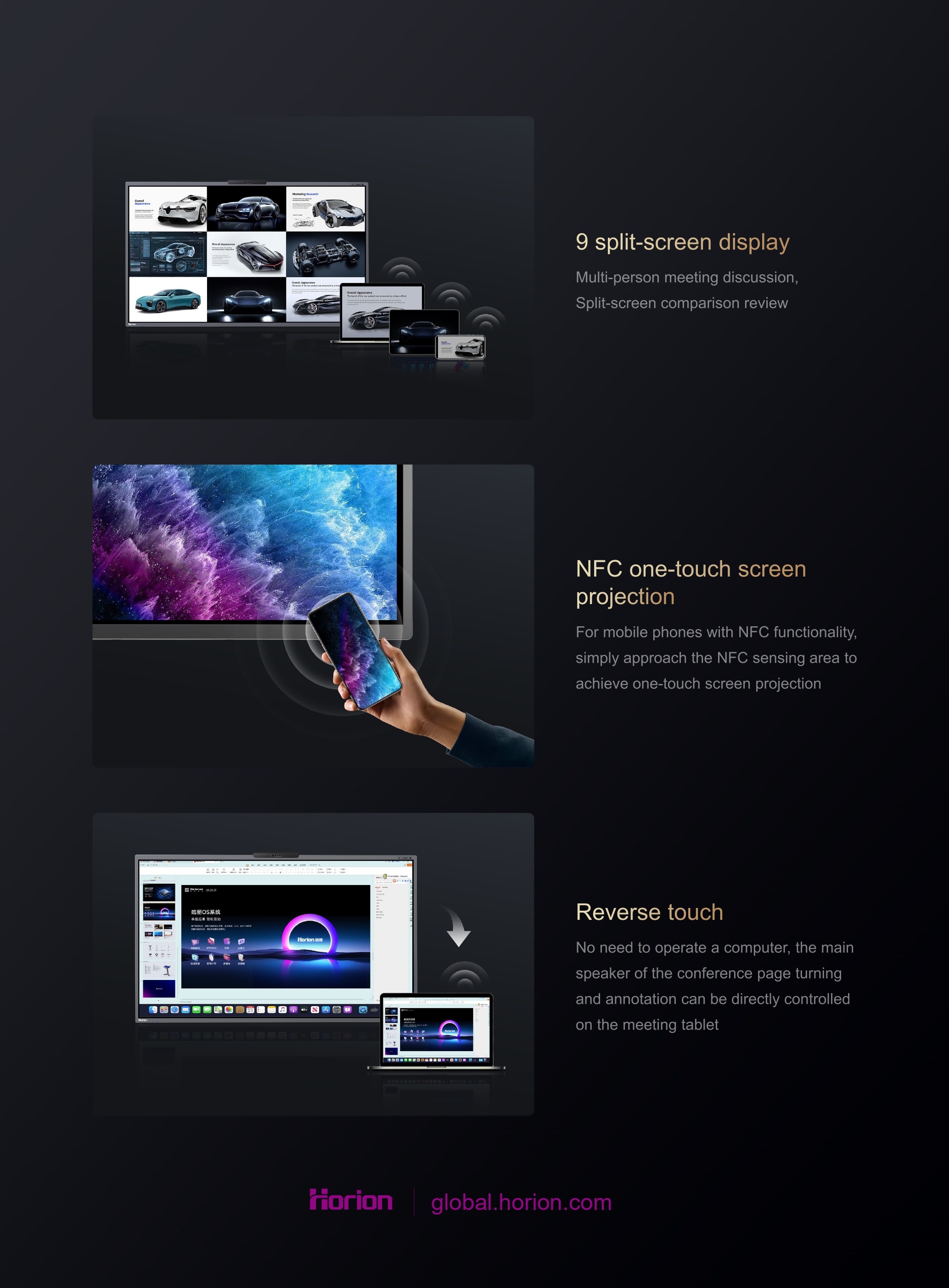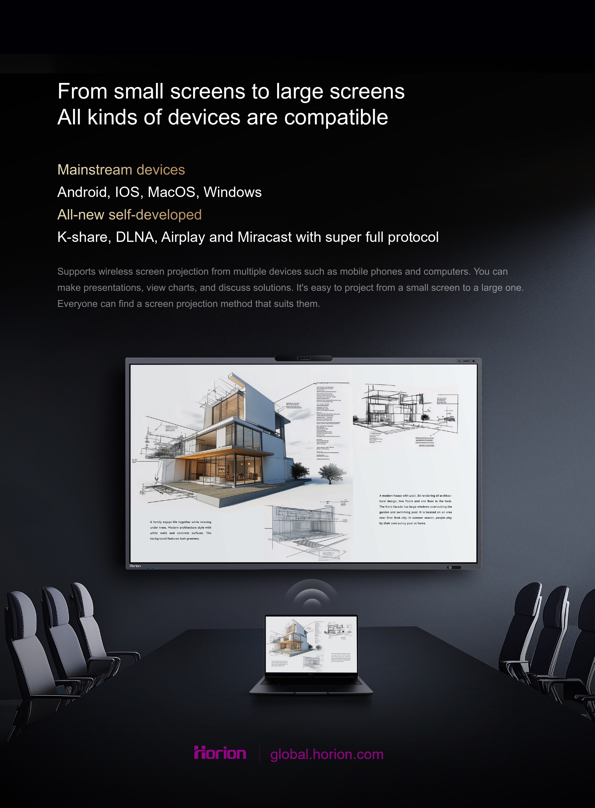 Menyokong paparan 4K, membolehkan mirroring skrin laptop ke Horion Interactive Flat Panel dengan mud..